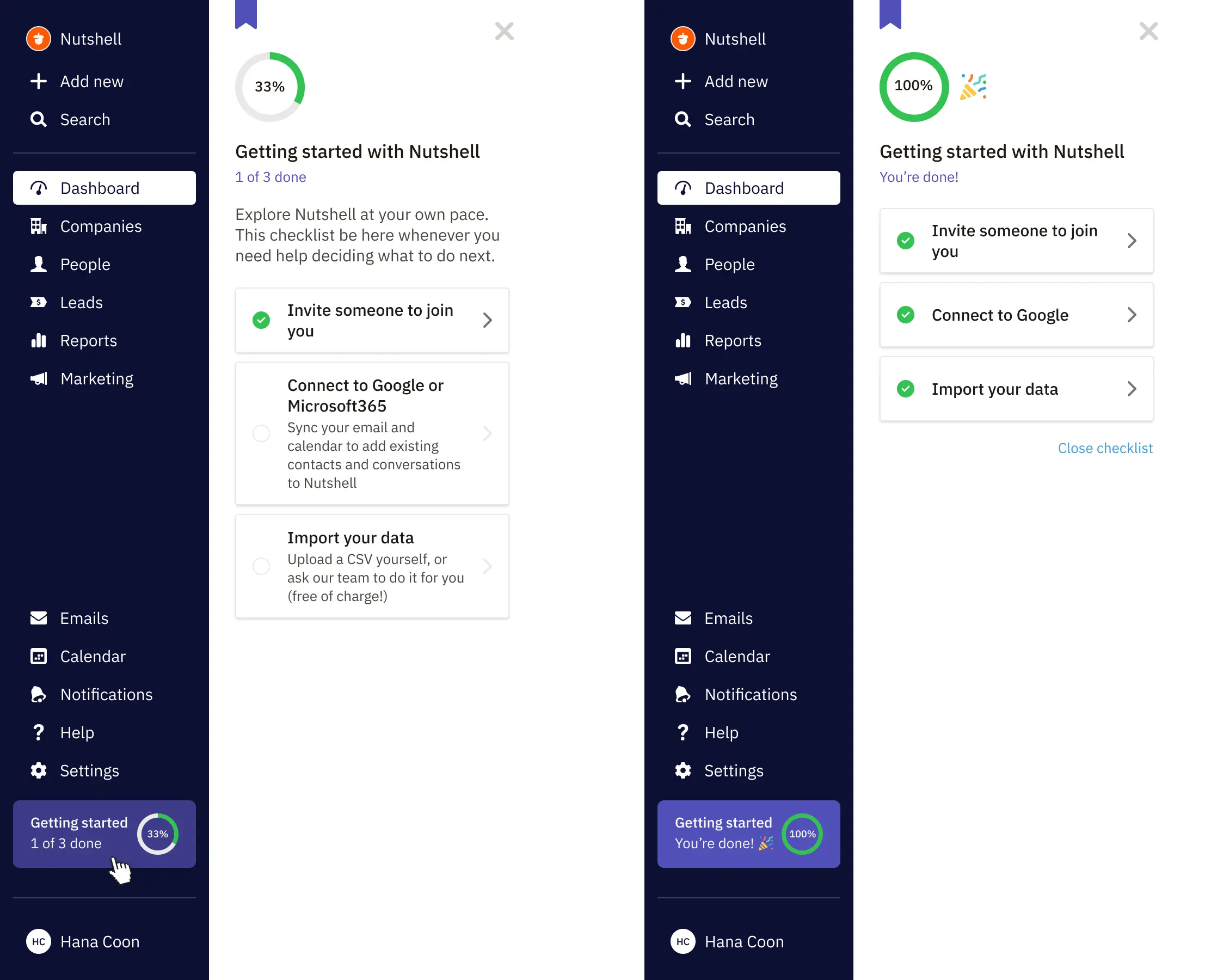 Nutshell's original onboarding checklist had several issues. It was overcrowded with tasks, unclear how to mark each item as complete, and didn’t effectively communicate progress towards completion.